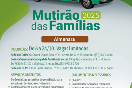 Almenara recebe o atendimento em novembro. Inscrições vão até dia 24 de outubro ALMENARA – A Defensoria Pública de Minas Gerais (DPMG), por meio do projeto Defensoria Pública Itinerant...