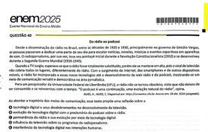 A questão do ENEM 2025 propôs uma reflexão sobre a trajetória dos meios de comunicação, enfatizando o processo de transformação do rádio diante da tecnologia digital. O texto dos estudantes da UFU foi usado como exemplo de como o rádio, mesmo centenário, continua se reinventando e ocupando novos espaços no cenário midiático.