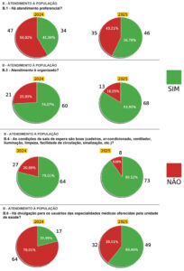 Em relação a 2024, a presença de atendimento preferencial cresceu 35,3% (de 34 para 46 unidades), o atendimento ficou mais organizado (melhora de 13,3%) e salas de espera e banheiros estavam em melhores condições. Houve também aumento expressivo (188,24%) da divulgação das especialidades médicas nas entradas das unidades (antes, eram 17; em 2025, 49 disponibilizaram as informações).