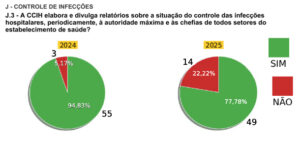 Subiu de 10 para 20 o número de unidades sem auditoria interna para revisar ponto/frequência dos profissionais (piora de 100%). Também houve retrocesso quanto à apresentação dos relatórios das Comissões de Controle de Infecção Hospitalar (CCIH). Eram apenas três unidades em 2024 e, desta vez, foram 14 estabelecimentos sem produzir relatórios.